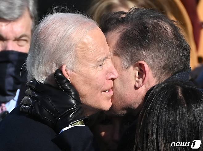 (워싱턴 AFP=뉴스1) 우동명 기자 = 조 바이든 미국 대통령이 20일(현지시간) 워싱턴 의사당에서 취임선서를 마친 뒤 아들 헌터와 볼을 맞대고 있다.