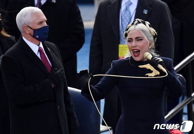 (워싱턴 AFP=뉴스1) 우동명 기자 = 마이크 펜스 전 미국 부통령이 20일(현지시간) 워싱턴 의사당에서 열린 취임식서 국가를 부르는 가수 레이디 가가를 바라보고 있다.