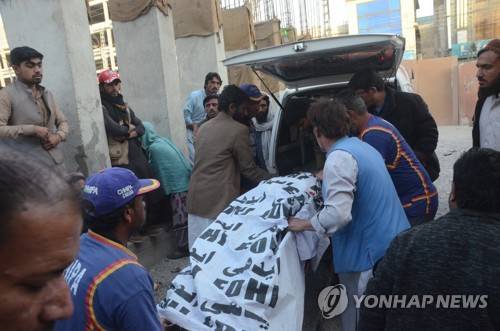 epa08955618 Rescue workers transport the body of a bus accident victim to a hospital in Quetta, Pakistan, 21 January 2021. According to reports, at least three people were killed and 26 injured when two passenger buses collided head on outskirts of Quetta. EPA/JAMAL TARAQAI
