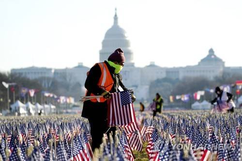 Workers begin to remove a display of flags on the National Mall one day after the inauguration of President Joe Biden, Thursday, Jan. 21, 2021, in Washington. (AP Photo/Julio Cortez)