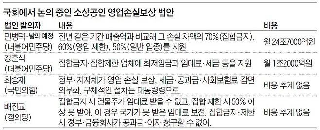 여당의 강훈식 의원은 이미 영업이 제한된 자영업자에게 일정 수준 보상금을 주는 법 개정안을 발의했다. 휴업한 기간 동안 최저임금 정도를 맞춰주고, 임차료·공과금 등도 일부 보상해 주자는 내용이다. 이 방안에도 월 1조2000억원이 들어간다. 이 외에도 정부 부처에 손실보상심의위원회 같은 것을 설치해 보상 여부를 결정하자는 법안, 집합금지·제한 업종에 포함되면 정부나 금융회사가 공과금과 이자를 청구할 수 없게 하자는 법안도 발의되어 있다. 더불어민주당 5건, 국민의힘 3건, 정의당 1건 등 법안이 각축 중이다.