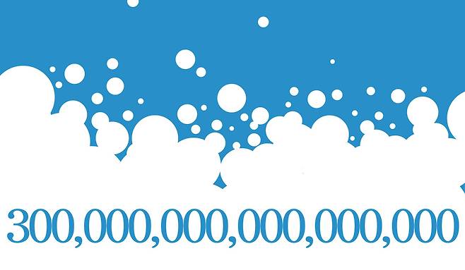 2020년 말 IIF(국제금융협회)가 추산한 전 세계 정부와 기업, 개인이 진 빚(부채)의 총액이다. 삼성전자 2019년 매출(230조원)의 1300배, 대한민국 2021년 예산(555조원)의 540배에 이르는 액수다. 심지어 전 세계 200여 나라의 지난해 국내총생산(GDP)을 모두 합친 것의 3.65배에 달한다. 세계인이 3년 8개월간 번 돈을 한 푼도 안 쓰고 모두 털어 넣어야 겨우 갚을 수 있다는 뜻이다.
