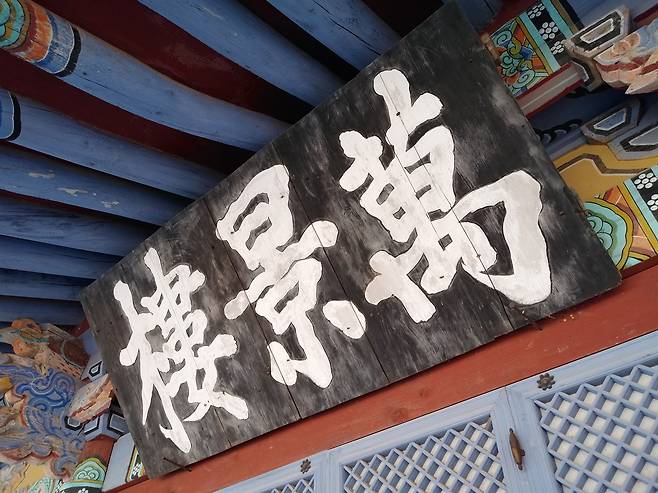 | ▲ 만경루 현판 백련사 안마당으로 들어가는 누마루인 만경루의 현판으로, 역시 이광사의 작품이다. |