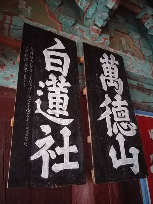 '백련사(白蓮社)'의 현판을 지금도 볼 수 있다. 주 법당인 대웅보전 안쪽 벽에 모셔져 있다. 건물 외벽에 사용된 것이라기보다, 이곳에서 모임을 할 때 마치 배경 현수막처럼 쓰였을 것으로 보인다. 대체 이곳에선 언제 누가 무슨 이유로 모였을까.