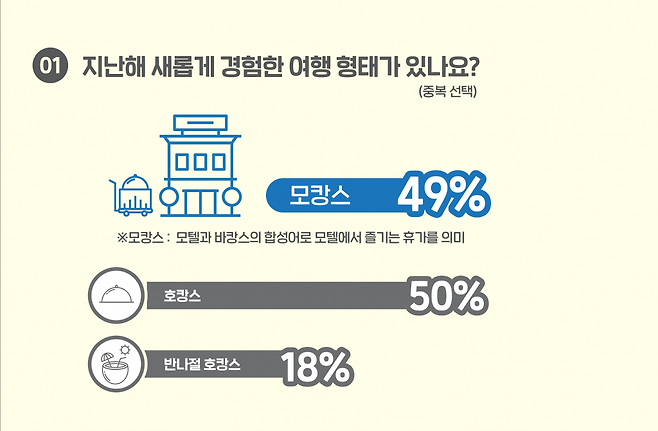 해외여행 대체재로 등장한 다양한 국내여행 테마 중 호캉스(50%)와 함께 20대의 새로운 여가행태로 자리잡은 것이다. 이는 13%에 불과했던 50대와 비교하면 무려 36%p 높은 것으로, 국내 모텔 수요가 20대를 중심으로 재편되고 있는 것이다. 맛집의 음식을 배달해 조촐한 모임을 갖거나, OTT(온라인동영상서비스) 영상물을 시청하는 등 기존 숙박에 한정됐던 모텔의 이용형태를 확장하게 되면서다.