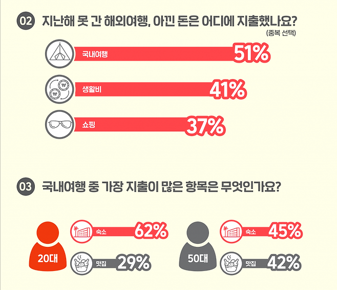 20대 국내여행 경비(1박2일 기준)는 평균 26만5800원이었다. 지출이 가장 큰 항목은 숙소로 전체의 49%를 차지했다. 반면 50대는 지난해 국내여행 경비가 평균 42만5800원이었고 숙소 비중은 39%로 20대보다 다소 낮았다.