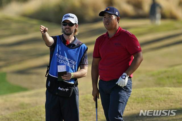 [라킨타=AP/뉴시스]안병훈(오른쪽)이 21일(현지시간) 미 캘리포니아주 라 킨타의 PGA웨스트 니클라우스 토너먼트 코스에서 열린 미프로골프(PGA) 투어 아메리칸 익스프레스 첫날 18번 홀에서 캐디와 함께 거리를 가늠하고 있다. 안병훈은 7언더파 65타로 선두 브랜든 하기(미국)에 1타 뒤진 단독 2위로 첫날을 마쳤다. 2021.01.22.