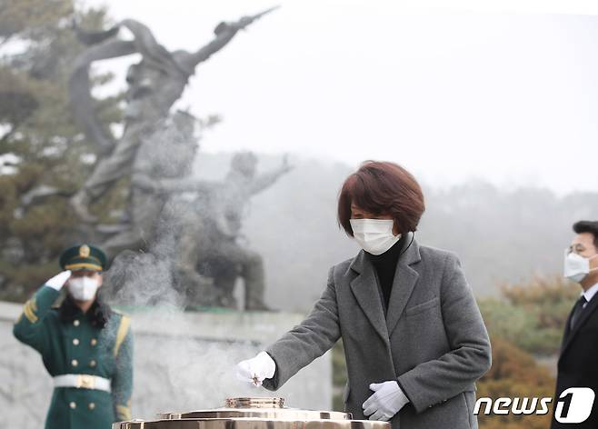 (서울=뉴스1) 박정호 기자 = 한정애 신임 환경부 장관이 22일 오전 서울 동작동 국립서울현충원 현충탑을 찾아 참배, 분향하고 있다. 2021.1.22/뉴스1