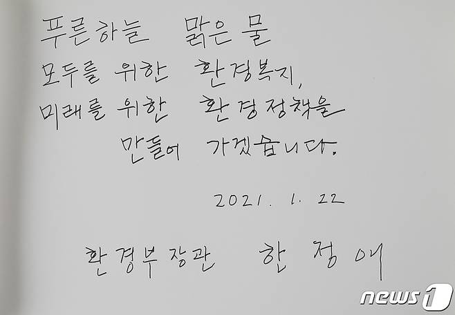 (서울=뉴스1) 박정호 기자 = 한정애 신임 환경부 장관이 22일 오전 서울 동작동 국립서울현충원 현충탑을 찾아 참배 후 방명록을 남겼다. 한 장관은 방명록에 '푸른하늘 맑은 물 모두를 위한 환경복지, 미래를 위한 환경정책을 만들어 가겠습니다'라고 적었다. 2021.1.22/뉴스1