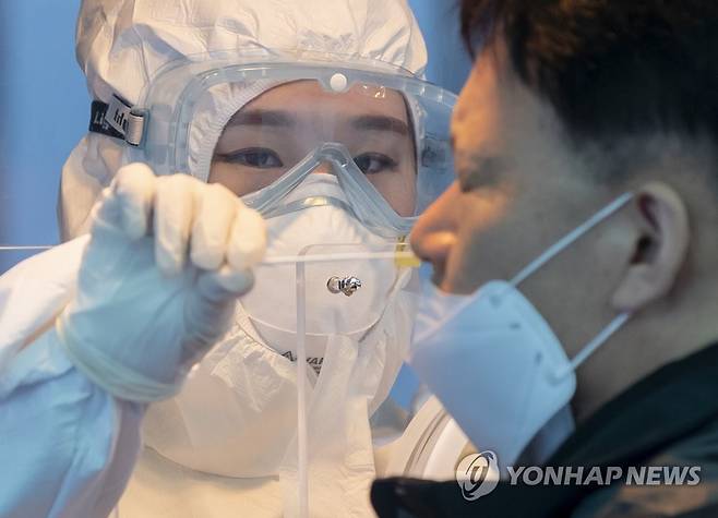 (서울=연합뉴스) 김도훈 기자 = 국내 신종 코로나바이러스감염증(코로나19) 신규 확진자 수가 두 달여 만에 최소치를 기록한 22일 오전 서울역 앞에 마련된 임시선별검사소에서 의료진이 검체 채취를 하고 있다.