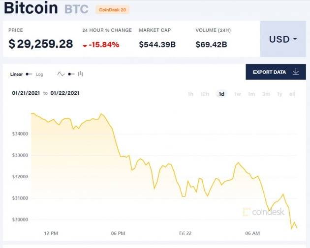 지난 2일 사상 처음으로 3만달러를 돌파했으나 약 20일 만에 다시 3만 달러 아래로 떨어진 것이다. 지난 8일 기록했던 최고가(4만1986.37달러) 대비해선 약 30% 급락했다.
