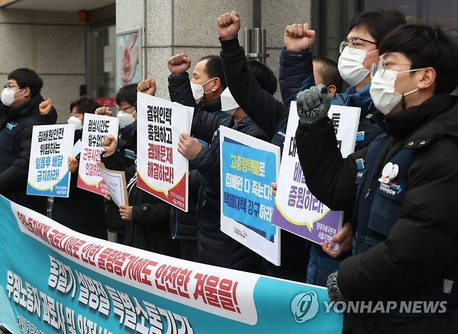 (서울=연합뉴스) 류효림 기자 = 22일 오전 서울 종로구 광화문우체국 앞에서 열린 동절기·설 명절 특별소통기간 우정노동자 과로사 및 안전사고예방 대책요구 기자회견에서 민주노총 전국공공운수노조 민주우체국본부 관계자들이 구호를 외치고 있다. 2021.1.22