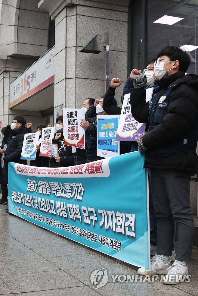 (서울=연합뉴스) 류효림 기자 = 22일 오전 서울 종로구 광화문우체국 앞에서 열린 동절기·설 명절 특별소통기간 우정노동자 과로사 및 안전사고예방 대책요구 기자회견에서 민주노총 전국공공운수노조 민주우체국본부 관계자들이 구호를 외치고 있다. 2021.1.22