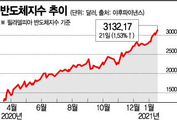 이 지수는 엔비디아, 인텔 등 미국 주식시장에 상장한 시가총액 상위 30개 반도체 관련 기업의 주가를 지수화한 것으로, 세계 반도체 경기의 척도로 불린다. 1000대이던 필라델피아반도체지수는 유동성 공급으로 증시가 상승세를 보이자 지난해 중순 2000 선을 넘어선 뒤 올해 3000 선도 돌파했다. 블룸버그통신은 "반도체주가 가격 상승과 소비 확대에 따른 반도체 칩 수요 급증을 바탕으로 9년 만에 최고의 1월을 보내고 있다"고 설명했다.