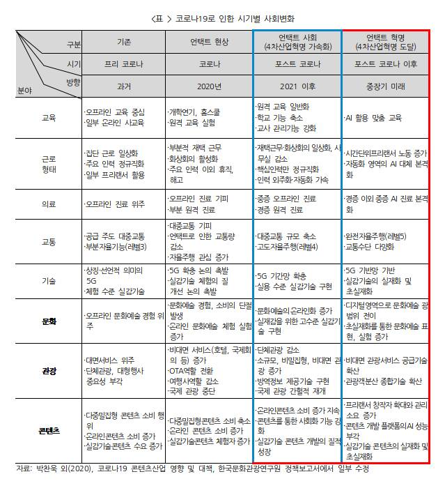아래 표는 코로나19가 발생했던 4월 경 코로나19로 인한 사회 변화를 예측하며 작성했던 표를 일부 수정한 것이다. 코로나19로 인해 비대면 상황이 강요되었던 2020년 시점을 ‘언택트 현상’ 시기라면, 사회가 변화를 진지하게 받아들이기 시작하는 시점을 ‘언택트 사회(포스트 코로나)’ 시기로 볼 수 있고, 이것은 장차 4차산업혁명 정도의 수준까지 변화가 이뤄지는 시점인 ‘언택트 혁명(포스트 코로나 이후)’시기로 구분하여 살필 수 있다.