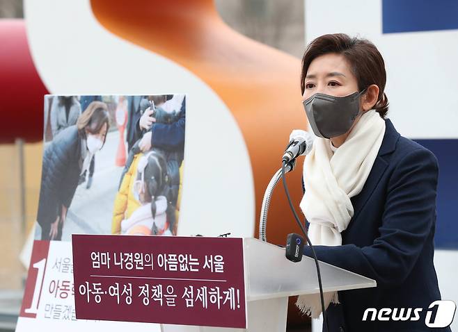 (서울=뉴스1) 국회사진취재단 = 서울시장 출마를 선언한 나경원 국민의힘 전 의원이 22일 오전 서울광장 앞에서 아동 및 여성 정책 발표를 하고있다. 2021.1.22/뉴스1