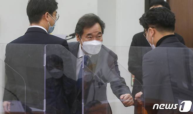(서울=뉴스1) 성동훈 기자 = 이낙연 더불어민주당 대표가 22일 오전 서울 여의도 국회에서 열린 소확행위원회 '금융비용 절감 상생협약식'에서 장경태, 민병덕 의원과 인사를 나누고 있다. 2021.1.22/뉴스1