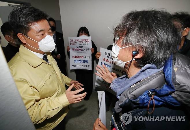 (서울=연합뉴스) 이재희 기자 = 공공운수노조원들이 22일 오전 서울 성동구 서울시사회서비스원 성동종합재가센터를 방문한 서정협 서울시장 권한대행(왼쪽)에게 긴급돌봄지원 요양보호사를 위한 방역대책을 촉구하고 있다. 2021.1.22