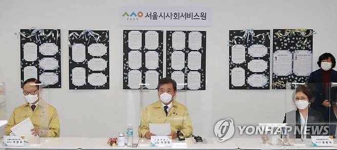 (서울=연합뉴스) 이재희 기자 = 서정협 서울시장 권한대행(가운데)이 22일 오전 서울 성동구 서울시사회서비스원 성동종합재가센터에서 열린 돌봄인력 간담회에서 인사말을 하고 있다. 2021.1.22