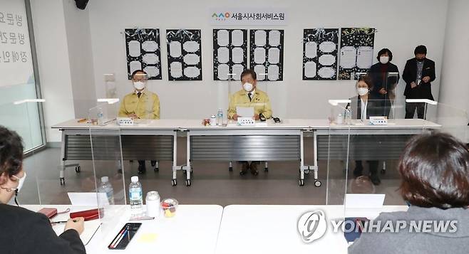 (서울=연합뉴스) 이재희 기자 = 서정협 서울시장 권한대행(가운데)이 22일 오전 서울 성동구 서울시사회서비스원 성동종합재가센터에서 열린 돌봄인력 간담회에서 인사말을 하고 있다. 2021.1.22
