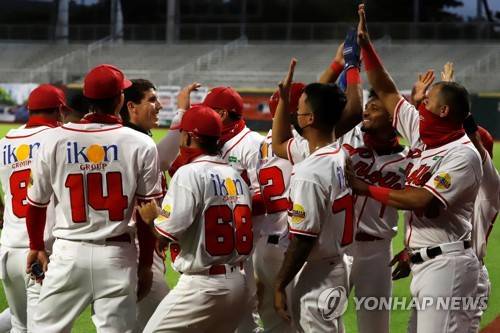 epa08956845 Players of Criollos de Caguas celebrate after defeating Indios de Mayaguez during the first game of the final series of the Roberto Clemente Professional Baseball League (LBPRC), between Criollos de Caguas and Indios de Mayaguez at the Hiram Bithorn Stadium in San Juan, Puerto Rico, 21 January 2021. EPA/Thais Llorca