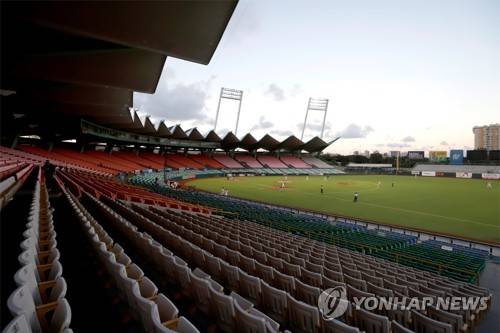 epa08956850 View of stands without fans due the restriction for coronavirus during the first game of the final series of the Roberto Clemente Professional Baseball League (LBPRC), between Criollos de Caguas and Indios de Mayaguez at the Hiram Bithorn Stadium in San Juan, Puerto Rico, 21 January 2021. EPA/Thais Llorca