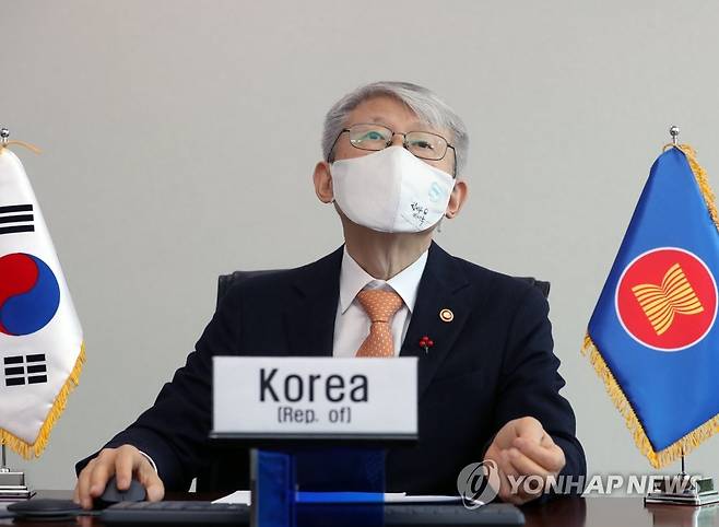 (서울=연합뉴스) 최기영 과학기술정보통신부 장관이 22일 오후 서울 중구 서울중앙우체국에서 화상회의로 개최된 '제1차 한-아세안 디지털장관회의'를 진행하고 있다. 2021.1.22