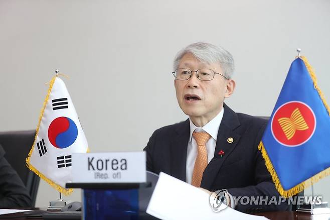(서울=연합뉴스) 최기영 과학기술정보통신부 장관이 22일 오후 서울 중구 서울중앙우체국에서 화상회의로 개최된 '제1차 한-아세안 디지털장관회의'에서 발언하고 있다. 2021.1.22