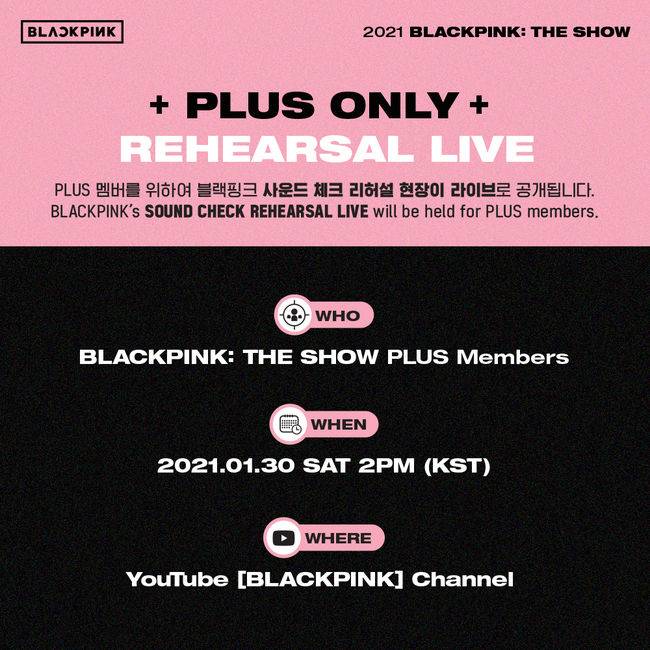 안내에 따르면 ‘BLACKPINK: THE SHOW’ 공연 하루 전날인 1월 30일 오후 2시(한국시간) 블랙핑크의 사운드 체크 리허설 현장이 실시간으로 공개된다.