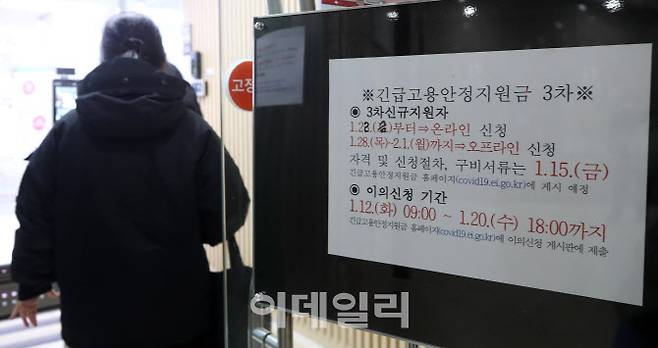 [이데일리 방인권 기자] 신종 코로나바이러스 감염증(코로나19) 사태로 어려움을 겪는 특수고용직(특고) 종사자와 프리랜서 가운데 지난해 1∼2차 긴급 고용안정지원금을 안 받은 사람을 대상으로 하는 3차 긴급 고용안정지원금 신청이 시작된 22일 오후 서울 중구 서울고용노동지방청에 신청 안내문이 붙어 있다.