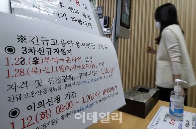 [이데일리 방인권 기자] 신종 코로나바이러스 감염증(코로나19) 사태로 어려움을 겪는 특수고용직(특고) 종사자와 프리랜서 가운데 지난해 1∼2차 긴급 고용안정지원금을 안 받은 사람을 대상으로 하는 3차 긴급 고용안정지원금 신청이 시작된 22일 오후 서울 중구 서울고용노동지방청에 신청 안내문이 붙어 있다.