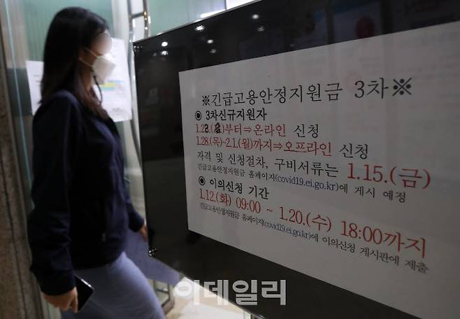 [이데일리 방인권 기자] 신종 코로나바이러스 감염증(코로나19) 사태로 어려움을 겪는 특수고용직(특고) 종사자와 프리랜서 가운데 지난해 1∼2차 긴급 고용안정지원금을 안 받은 사람을 대상으로 하는 3차 긴급 고용안정지원금 신청이 시작된 22일 오후 서울 중구 서울고용노동지방청에 신청 안내문이 붙어 있다.