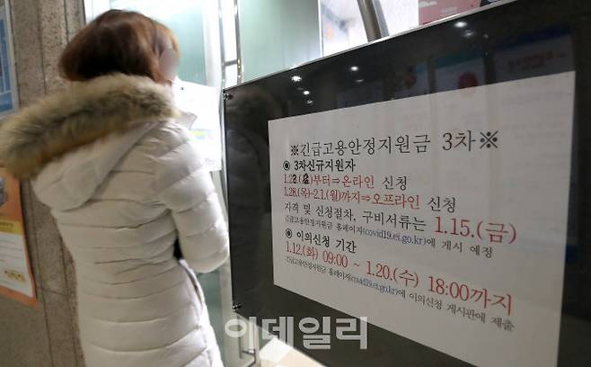 [이데일리 방인권 기자] 신종 코로나바이러스 감염증(코로나19) 사태로 어려움을 겪는 특수고용직(특고) 종사자와 프리랜서 가운데 지난해 1∼2차 긴급 고용안정지원금을 안 받은 사람을 대상으로 하는 3차 긴급 고용안정지원금 신청이 시작된 22일 오후 서울 중구 서울고용노동지방청에 신청 안내문이 붙어 있다.
