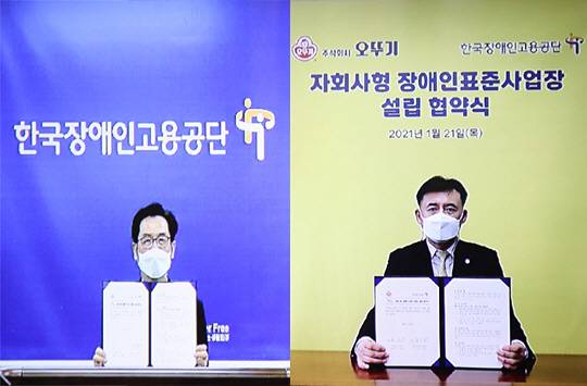 오뚜기는 지난 21일 한국장애인고용공단과 장애인 일자리 창출을 위한 ‘자회사형 장애인표준사업장’ 설립 협약을 체결했다고 22일 밝혔다. 남용현(왼쪽) 한국장애인고용공단 고용촉진이사와 황성만 오뚜기 부사장이 화상으로 협약을 진행하고 있다.