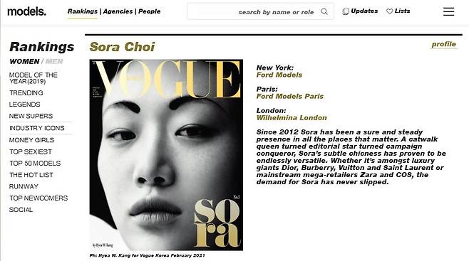 모델 최소라가 글로벌 모델 랭킹 사이트 ‘모델스닷컴’ 인더스트리 아이콘(Industry Icons)에 선정됐다.