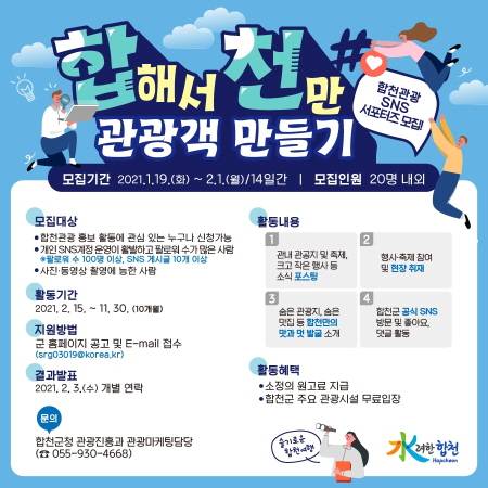 합천군(군수 문준희)은 1월 19일부터 2월 1일까지 14일간 '합해서 천만관광객 만들기'라는 제목 아래 합천관광 SNS 서포터즈를 모집한다.