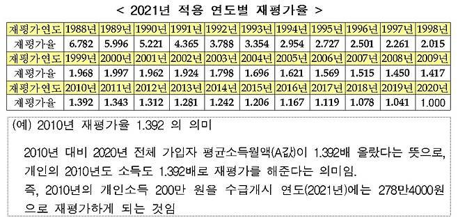 2021년도에 적용되는 연도별 재평가율은 ‘2020년도 A값’을 ‘매년도 말 산출된 A값(재평가연도별 A값)’으로 나누어 결정된다.