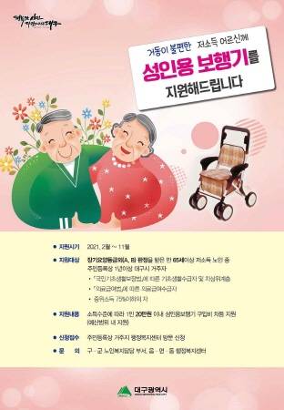 이에 대구시는 거동이 불편하지만, 성인용 보행기 지원을 받지 못하는 저소득 어르신에게 성인용 보행기 구매비를 지원함으로써 대상 어르신들의 보행 편의 등 일상생활에 많은 도움을 줄 것으로 기대하고 있다.