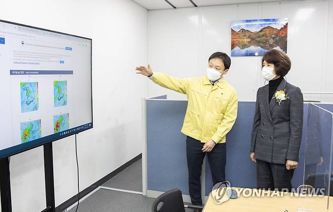 (서울=연합뉴스) 한정애 환경부 장관이 22일 세종시 정부세종청사에서 취임식을 마친 직후 미세먼지 상황실을 방문해 미세먼지 관리현황을 점검하고 있다. 2021.1.22
