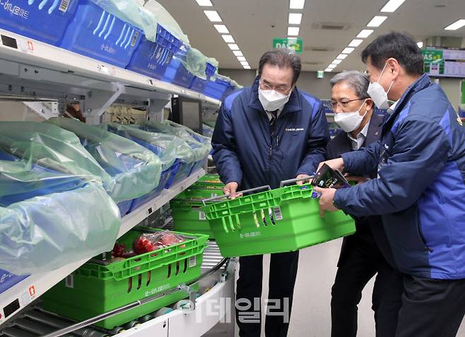 [이데일리 김태형 기자] 이성희(왼쪽) 농협중앙회장이 22일 취임 1주년을 맞아 농협 온라인사업에서 디지털풀필먼트센터(DFC) 시스템이 처음 적용된 성남유통센터를 찾아 김병수 하나로유통 대표이사 등과 현장 상황을 점검하고 있다.