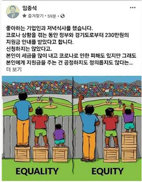 이를 두고, 임 전 비서실장이 이재명 경기도지사가 도민 전체에 10만 원씩 재난지원금을 지급하기로 한 것을 에둘러 비판한 것이라는 분석이 나오고 있습니다