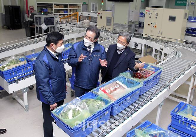 [이데일리 김태형 기자] 이성희(가운데) 농협중앙회장이 22일 취임 1주년을 맞아 농협 온라인사업에서 디지털풀필먼트센터(DFC) 시스템이 처음 적용된 성남유통센터를 찾아 김병수 하나로유통 대표이사 등과 현장 상황을 점검하고 있다.