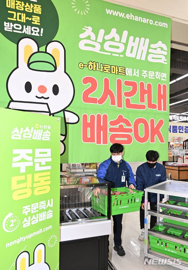 [성남=뉴시스] 김종택기자 = 22일 오후 경기도 성남시 분당구 성남유통센터내 디지털풀필먼트센터(DFC)에서 직원들이 상품 배송 작업을 작업을 하고있다. 디지털풀필먼트센터(DFC)는 고객이 온라인으로 상품을 주문하면 직원이 매장 상품을 피킹하여 매장 내 설치되어 있는 리프트와 천장레일로 옮겨 분류장으로 이동시키고 상품이 도착한 분류장에서는 주문별로 상품을 분배·패킹까지 완료 후 고객에게 배송하는 온라인 서비스이다. 2021.01.22.