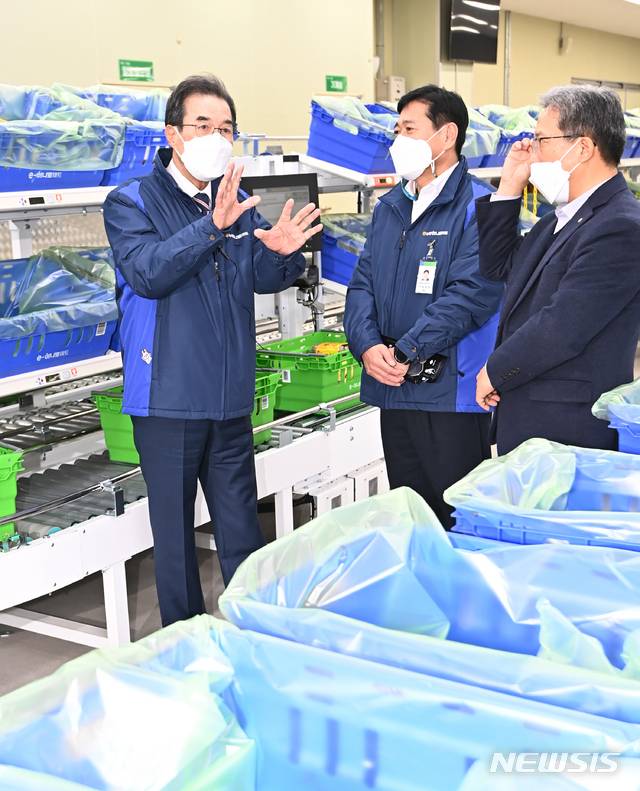 [성남=뉴시스] 김종택기자 = 이성희 농협중앙회 회장이 취임 1주년을 맞아 22일 오후 경기도 성남시 분당구 성남유통센터내 디지털풀필먼트센터(DFC) 를 방문해 현장점검을 하고 있다. 디지털풀필먼트센터(DFC)는 고객이 온라인으로 상품을 주문하면 직원이 매장 상품을 피킹하여 매장 내 설치되어 있는 리프트와 천장레일로 옮겨 분류장으로 이동시키고 상품이 도착한 분류장에서는 주문별로 상품을 분배·패킹까지 완료 후 고객에게 배송하는 온라인 서비스이다. 2021.01.22.