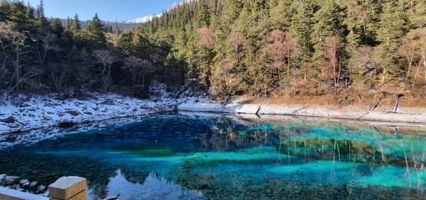 해발 4000m 이상의 고산의 물이 장해에 고이고, 이 물은 또 아래의 연못들로 흘러가리라. 그 첫 번째 연못이 바로 오채지(五彩池)다. 황룽의 맨 위에 있던 연못과 이름이 같다. 오채지는 규모는 작지만, 물빛이 제일 맑고 영롱해 '주자이거우의 눈'으로 불린다. 하얀 눈이 쌓인 음지는 색감의 대비 때문인지 물빛이 더 짙푸르고, 햇살이 비추는 곳은 엷어지며 연푸른 에메랄드가 된다.
