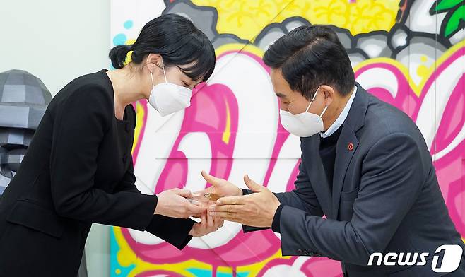 (제주=뉴스1) 오미란 기자 = 배우 이하나가 22일 제주도청에서 원희룡 제주도지사로부터 제주화장품인증제도 서포터즈 위촉패를 받고 있다.(제주도 제공)2021.1.22/뉴스1