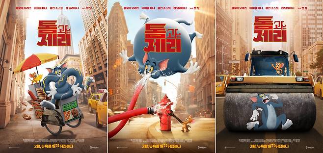 [스포츠조선 조지영 기자] 라이브 액션 영화 '톰과 제리'(팀 스토리 감독)가 3종 톰 수난 포스터가 공개됐다. 전 세계가 사랑하는 라이벌 콤비 톰과 제리라는 캐릭터의 특징이 고스란히 드러난 이미지들이 시선을 사로잡으며 추억을 불러일으키는 한편 색다른 즐거움을 전해 영화에 대한 기대감을 더한다.