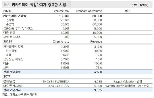 김동희 메리츠증권 연구원은 “올해 카카오페이의 거래액은 100조원(송금 60조원, 결제 20조원, 금융투자 5조원, 대출 10조원, 보험 5조원)으로 추정된다”며 카카오페이의 기업가치를 9조6000억원 규모로 전망했다.