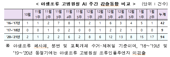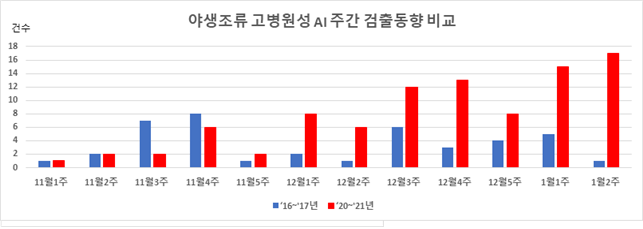 □ 최근 야생조류에서 고병원성 조류인플루엔자가 지속적으로 검출되고 있으며, 고병원성 조류인플루엔자가 심각했던 2016~2017년 동절기와 비교했을 때도 검출 건수가 대폭 증가한 것으로 나타났다.