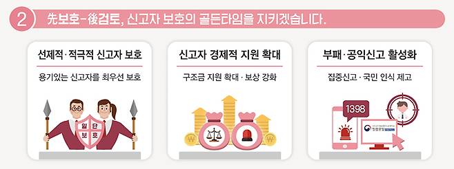 올해 권익위의 중점사업 중 하나는 신고 활성화 및 신고자 보호 조치로, 먼저 ‘선보호·후검토’로 적극적·선제적으로 신고자 보호를 강화할 방침이다.